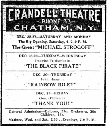 The Crandell Theatre was built in 1926 by Walter S. Crandell, a Chatham native and town civic leader throughout his life. A member of the New York Stock Exchange, he ran a Wall Street brokerage firm and was also president of the National Union Bank in Kinderhook.